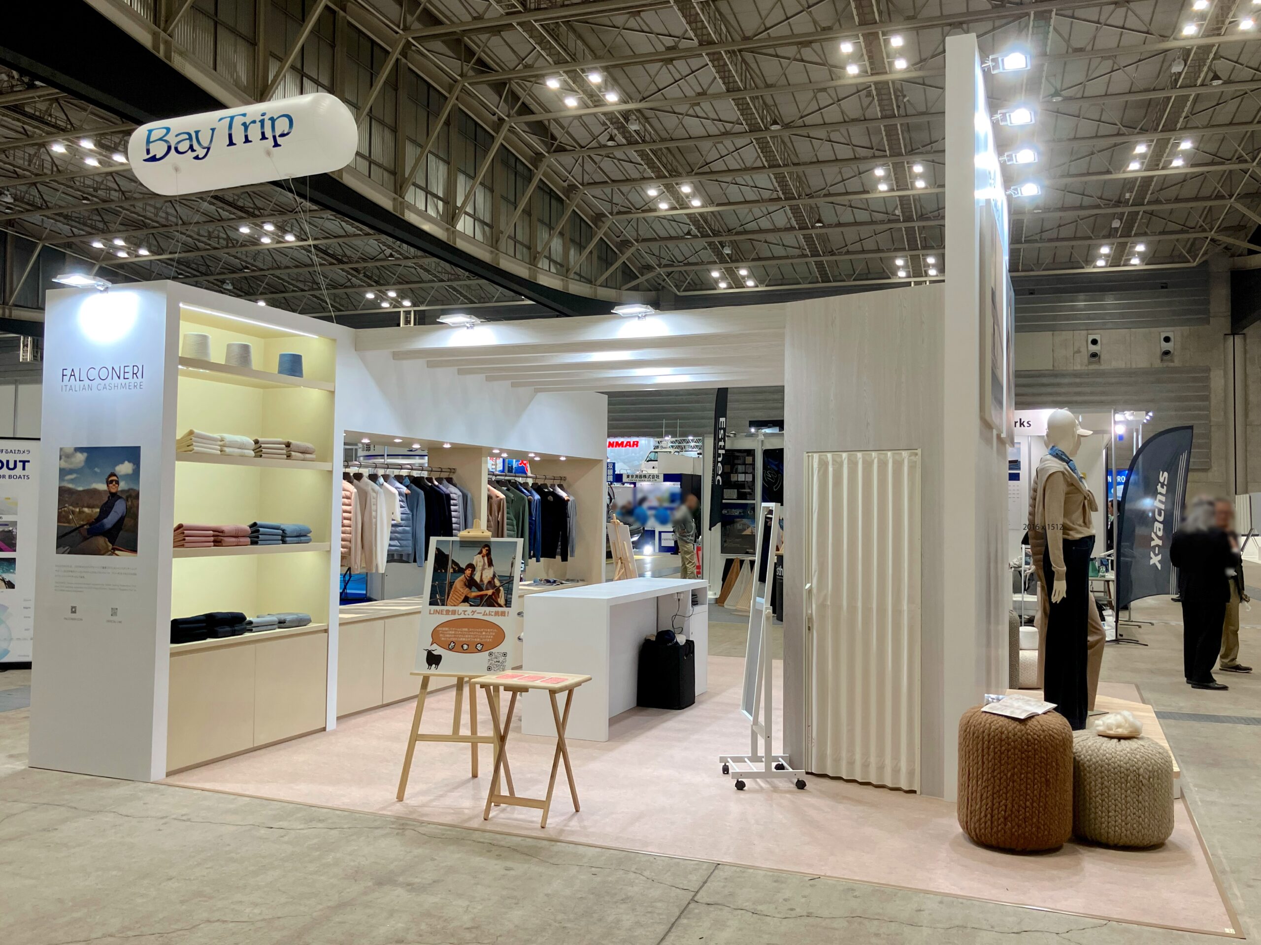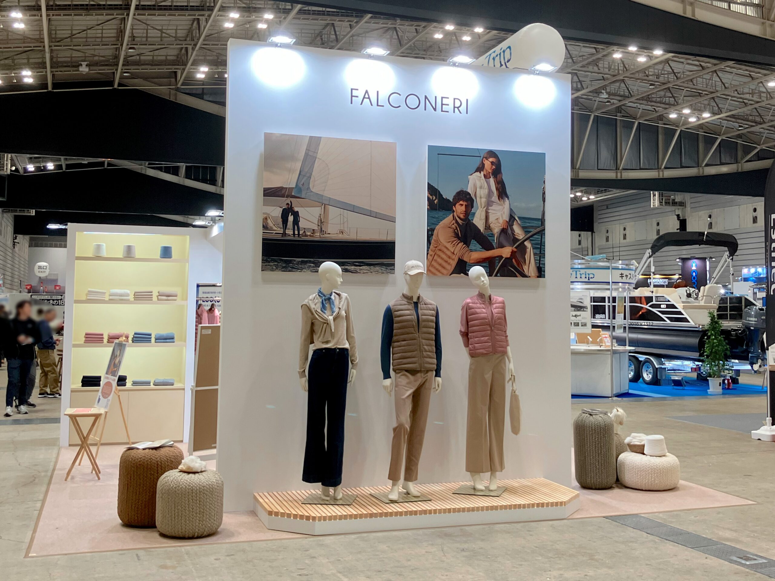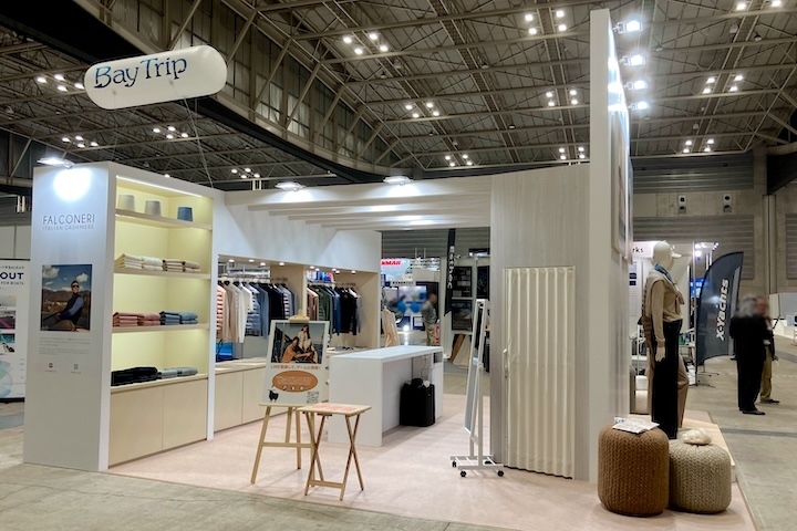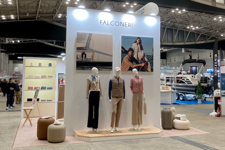 会場内には巨大なプレジャーボートの数々が展示され、体験イベントなども催される中でのアパレルブランドの展示でしたが、カルツェドニア・ジャパン様は、イタリアのセーリング連盟(FIV)をメインスポンサーとしてサポートするなど、マリンとの関わりが深いブランドで、今回初出展となります。