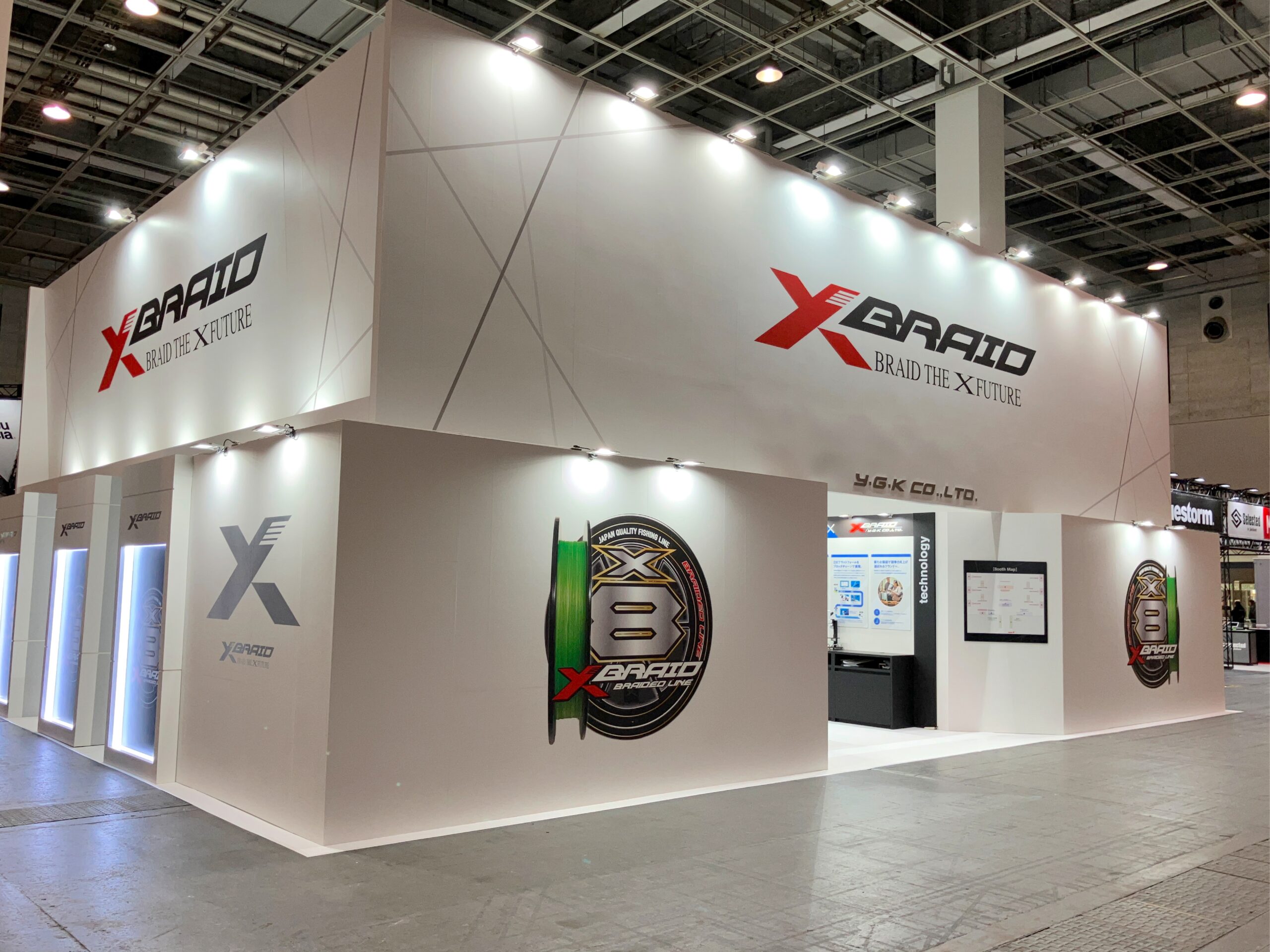 そのほかブースのすぐ傍に展示会場の躯体柱があったため、サインのサイズやグラフィックの見せ方なども微調整し、メイン通路に対して横長ブースの迫力を出すことができました。