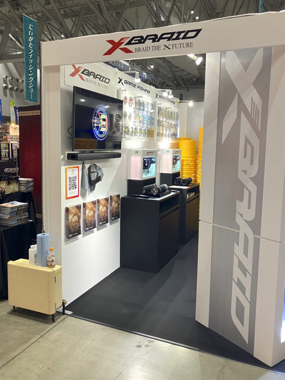 2小間と縮小サイズではありましたが、会場入り口に近い位置だったので、スプールのヴィジュアルやブランドロゴが目にとまりやすいように、什器の角度を付けるなど配置を工夫しました。
