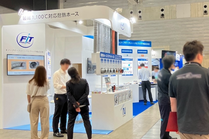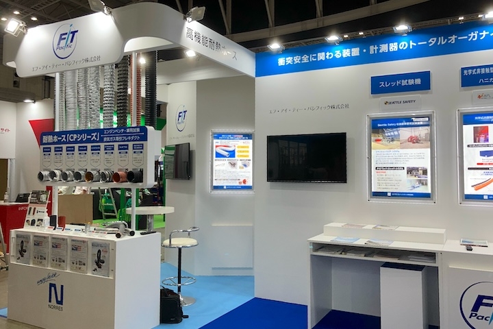 ブース左側のゾーンは、アールをつけたパラペットから商品の「耐熱ホース」を吊り下げて展示。