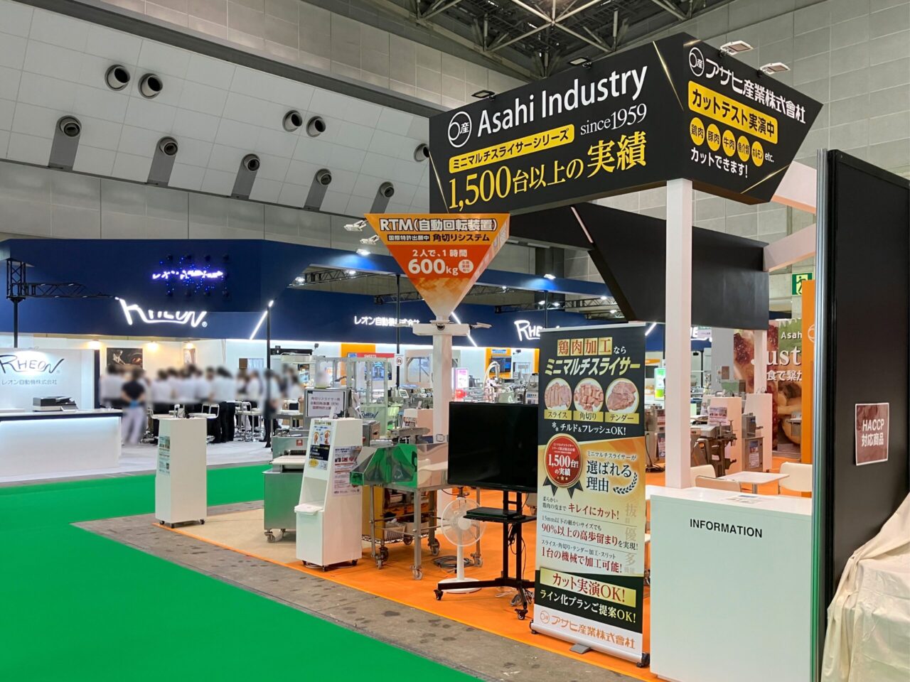 昨年に引き続きブース全体はオレンジを効かせ、メインの製品RTM(自動回転装置)に注目が集まるように、ピラミッドを逆さまにしたような形状の造作物にライトを当ててアクセントにしました。