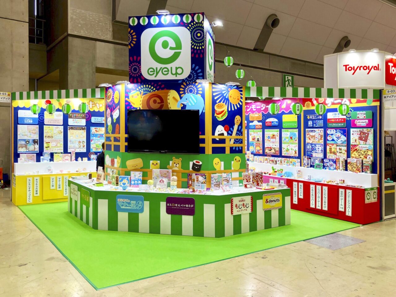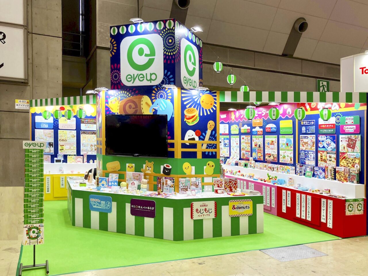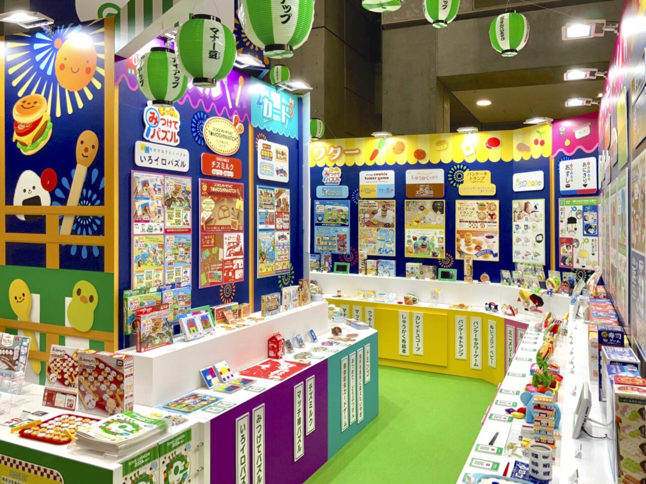 ■概要 知育玩具の楽しいワクワクする雰囲気をブース全体で表現しています。 今回は夏祭りがテーマなので、盆踊りのやぐらの造作と提灯が来場者の目を引き寄せます。 内部の展示はカテゴリー毎に色分け、商品名を掲示して整然と見やすいように工夫しました。