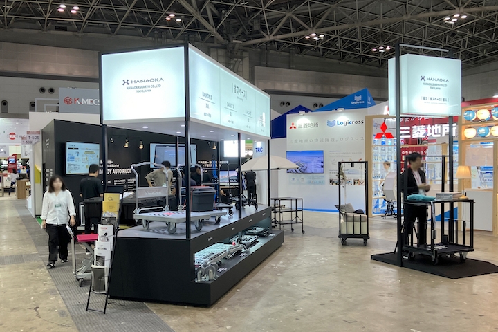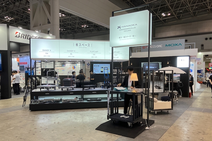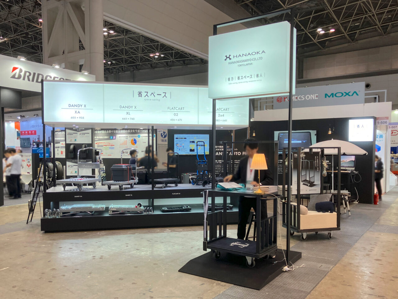 自律走行ロボット「DANDY AUTO-PILOT」や羽田空港で実証実験中の「IoT/クラウドサービス」、新製品の「ダンディポーターKAKUハンガー」の実機の展示などを行いました。
