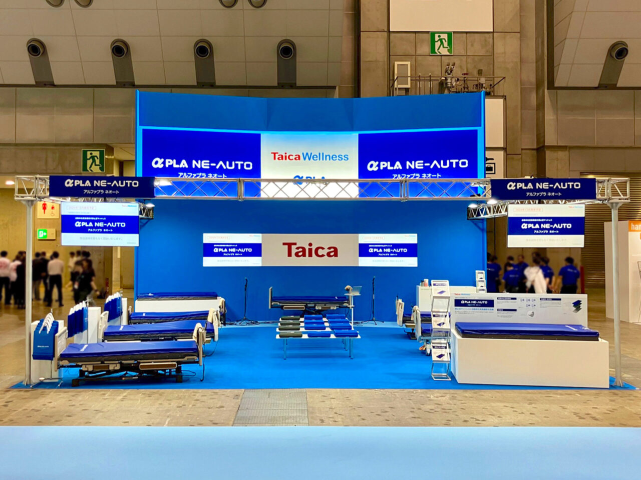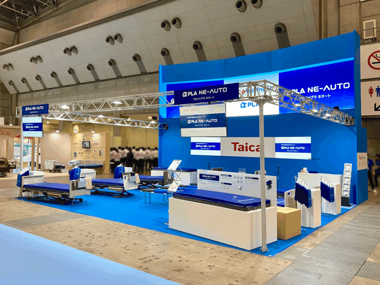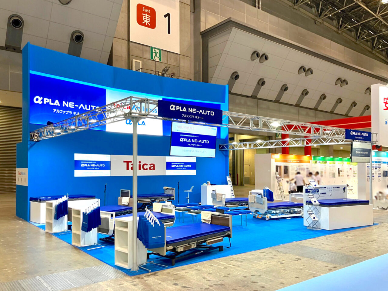 壁面高を最大限まで上げて社名の視認性を高めることと、展示スペースを広く確保し、来場者に福祉用具を実際に体験していただくようにオープンで入りやすいブースになっています。