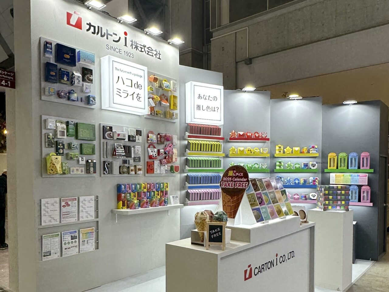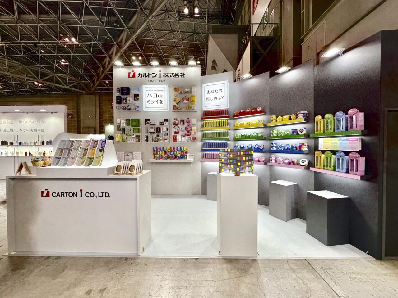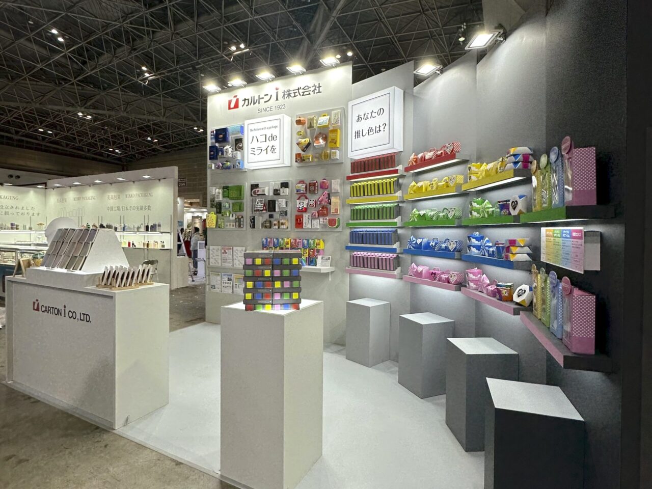 お得意とされる変形パッケージや窓貼りパッケージなど、バラエティに富んだ商品をお客様に効果的にディスプレイしていただいたことで、美しくてダイナミックな印象のブースになりました。