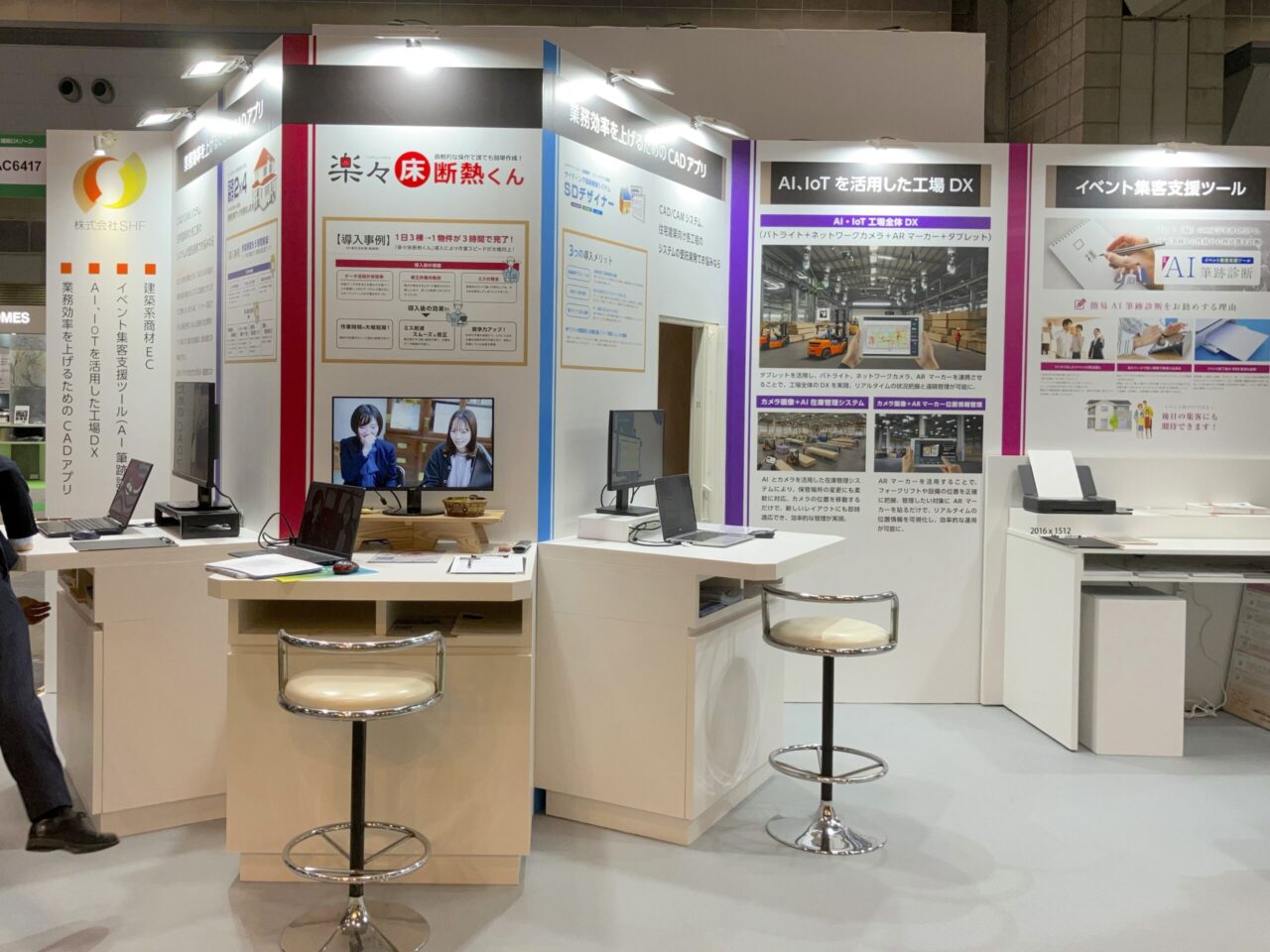 来場者に実際に操作を体験していただくので、横にスタッフが立てるよう展示台の配置を工夫。