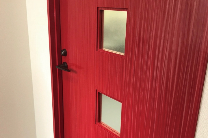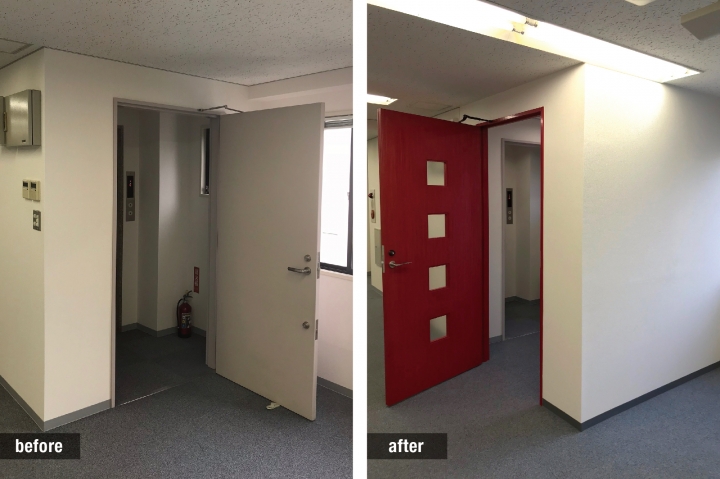 入り口ドアは社名ロゴに合わせて赤を効果的に使用し、シンプルな中にもアクティブな印象を演出しています。