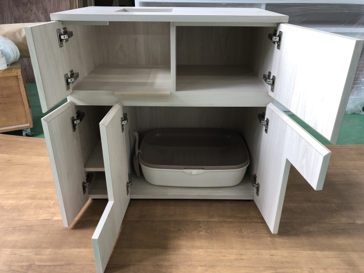 ②フードや砂のストックをスッキリ収納できる。